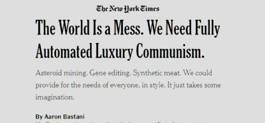„За да го разберем обаче, ще е необходима нова политика – пише “Ню Йорк Таймс“ – Политика, при която технологичната промяна служи на хората, не на печалбата. При която имаме осезаеми следствия – бързо намаляване на водородните емисии, пълна автоматизация и обществено здравеопазване, които са предпочитани за всички и не може да се представят за фантазии. Тази политика, която изглежда утопична на хоризонта и всекидневна по приложението си, се нарича изцяло автоматизиран луксозен комунизъм. Звучи добре, нали?“