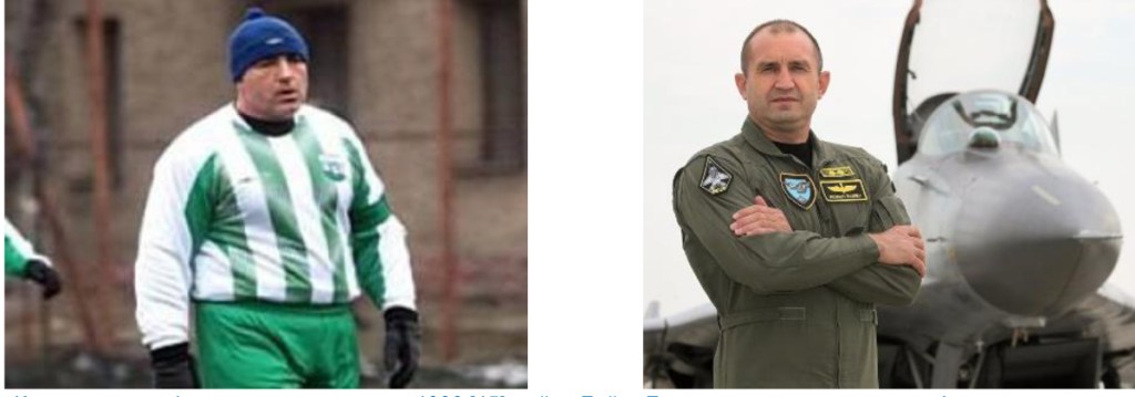 Кандидатът на физкултурните науки от 1990 майор Бойко Борисов, завеждащ катедра Физическа подготовка (вляво) и (вдясно) простият летец, шофьорът на самолет с образователна и научна степен „доктор“, „колежанчето“ подполковник Румен Радев, с колежанска характеристика на „Бъдещ стратегически лидер“ [1]
