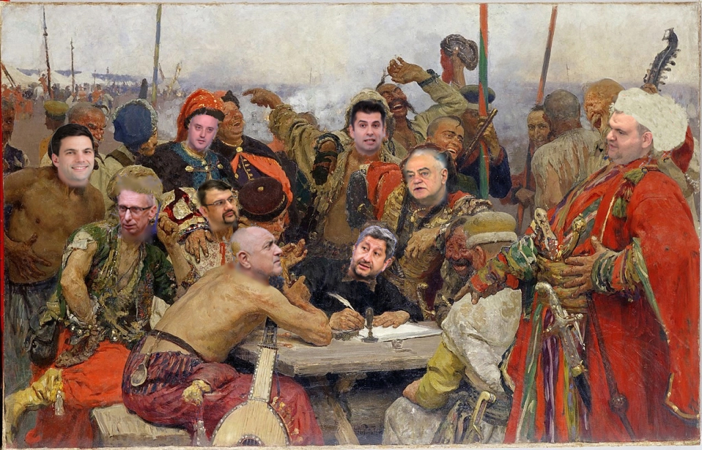 [15] Колажът е по репродукция на картината „Запорожци пишат писмо на турския султан“ – една от най-известните и значими картини на руския художник Иля Репин. Огромното пано (2,03×3,58) е започнато през 1880 и е завършено през 1891 г. Платното се съхранява в Държавния руски музей в Санкт Петербург.