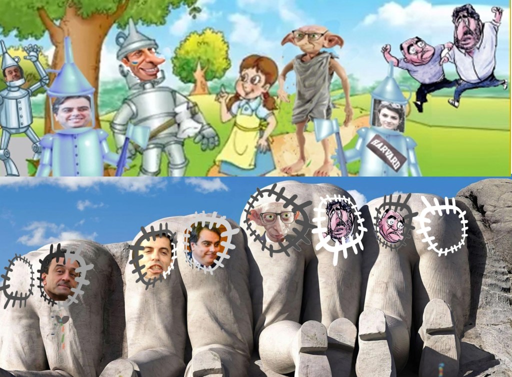 В публикацията „Тенекиените пришълци и аборигените от същия джинс“ колажите са направени върху илюстрации от приказката „Вълшебникът от Оз“ и публикацията във Фейсбук с надслов „Монумент на българската политика“ (профил на Владислав Петков), чийто оригинал пък е на агенция: Scholz & Friends, със заглавие „Другата страна на Америка